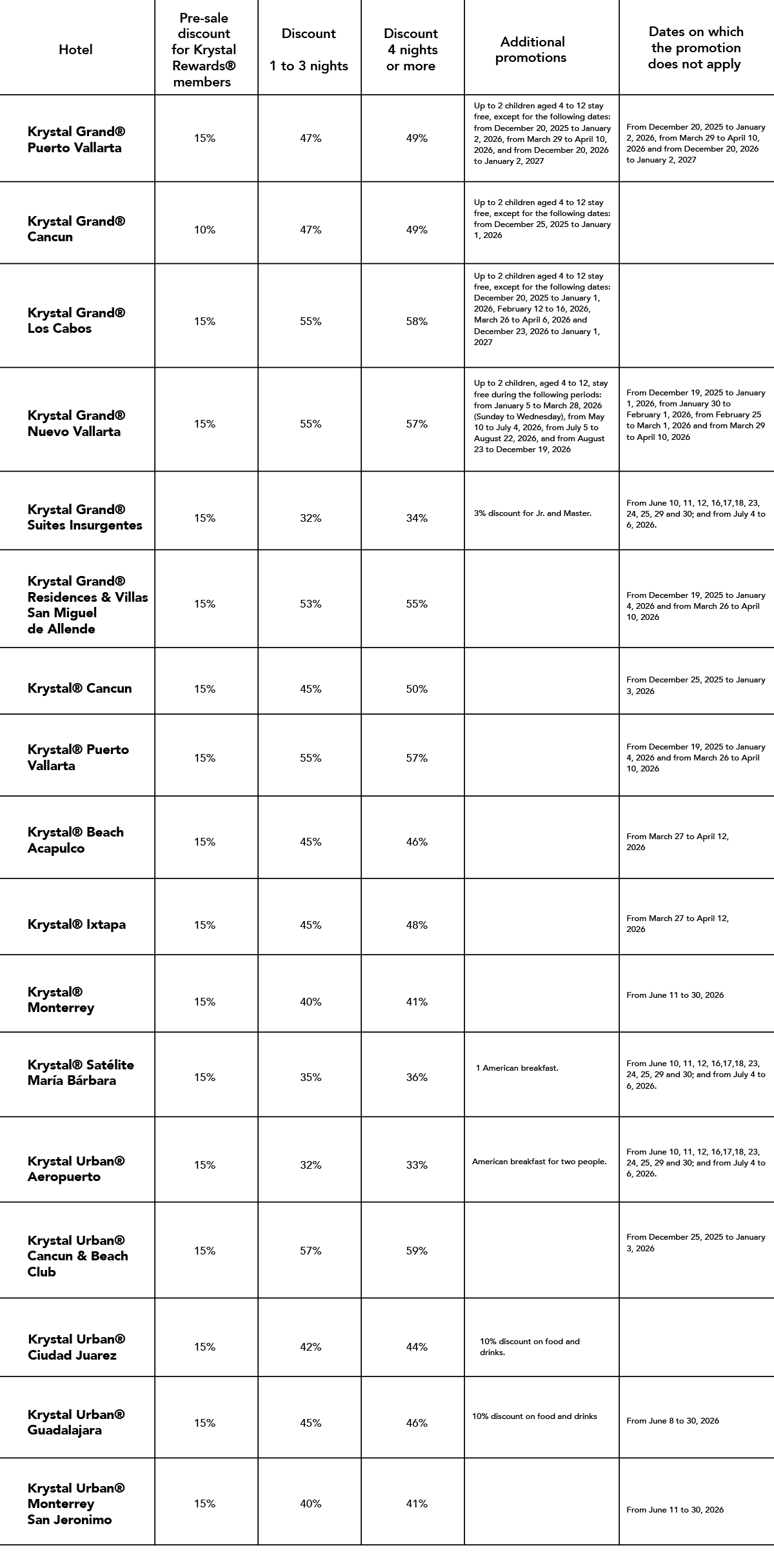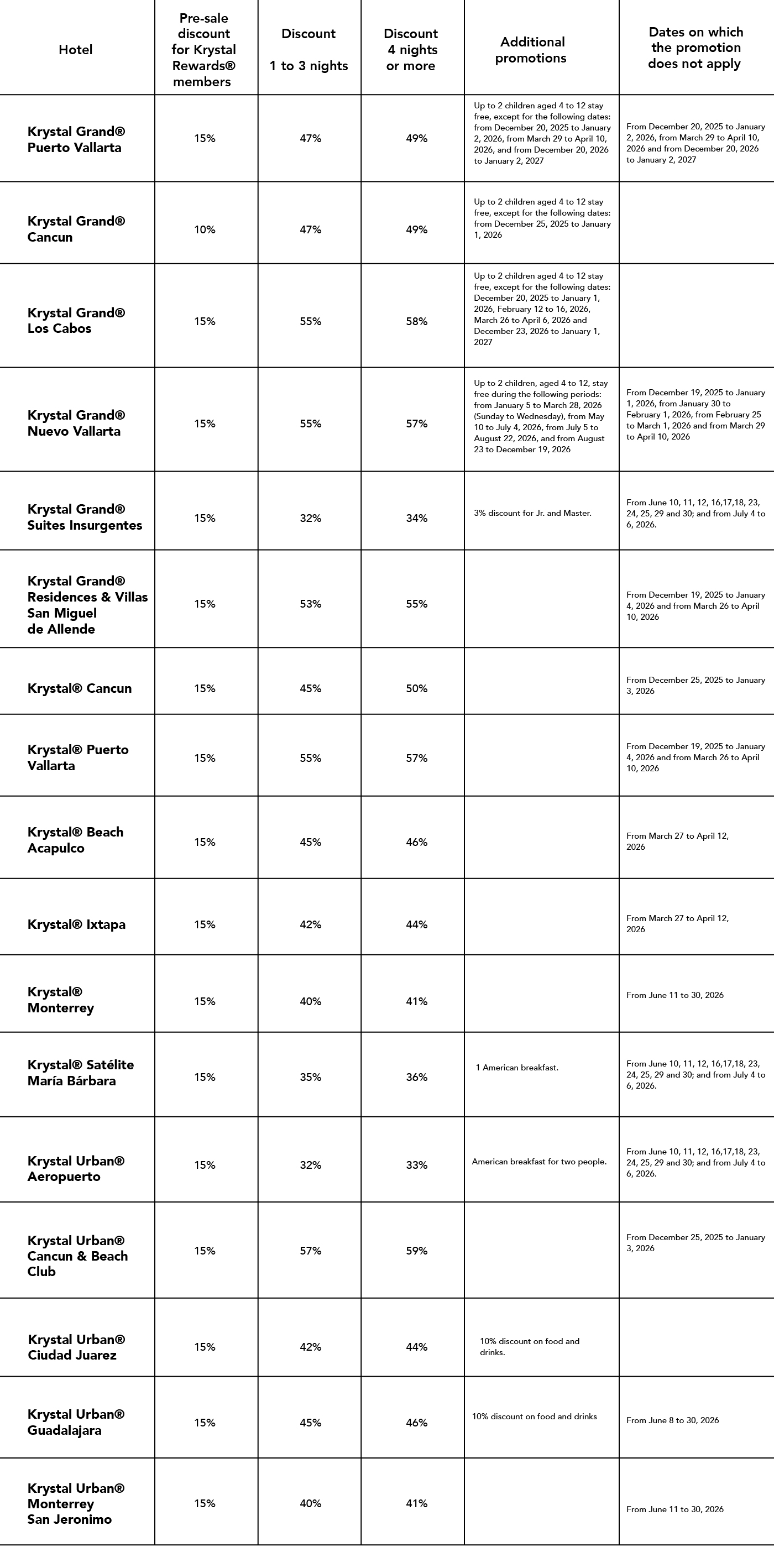 1. Exclusive presale for members of our Krystal Rewards® loyalty program, who can book from November 18 to 23, 2025, with an additional 15% discount on the discounts and rates published on our websites. Please note that this offer is subject to applicable taxes, including VAT and ISH (lodging tax). Only at the Krystal Grand® Cancun hotel can you obtain an additional 10% discount. To take advantage of this discount, you must log in to the website to see the offer.