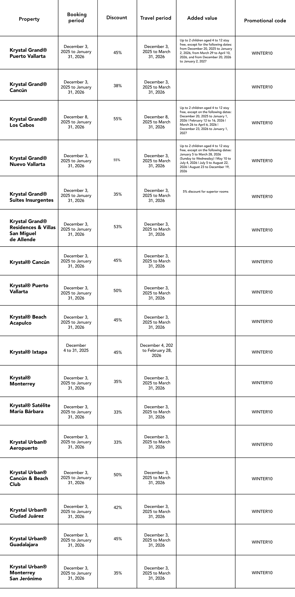 This promotional offer is for current and new Krystal Hotels & Resorts® guests who can book with an additional 10% discount when booking at our Krystal Hotels & Resorts® properties using the promotional code WINTER10. This discount applies to the rates published on our official website https://es.krystal-hotels.com and on the official websites of our individual properties. Please note that this offer is subject to applicable taxes, including VAT and ISH (lodging tax).