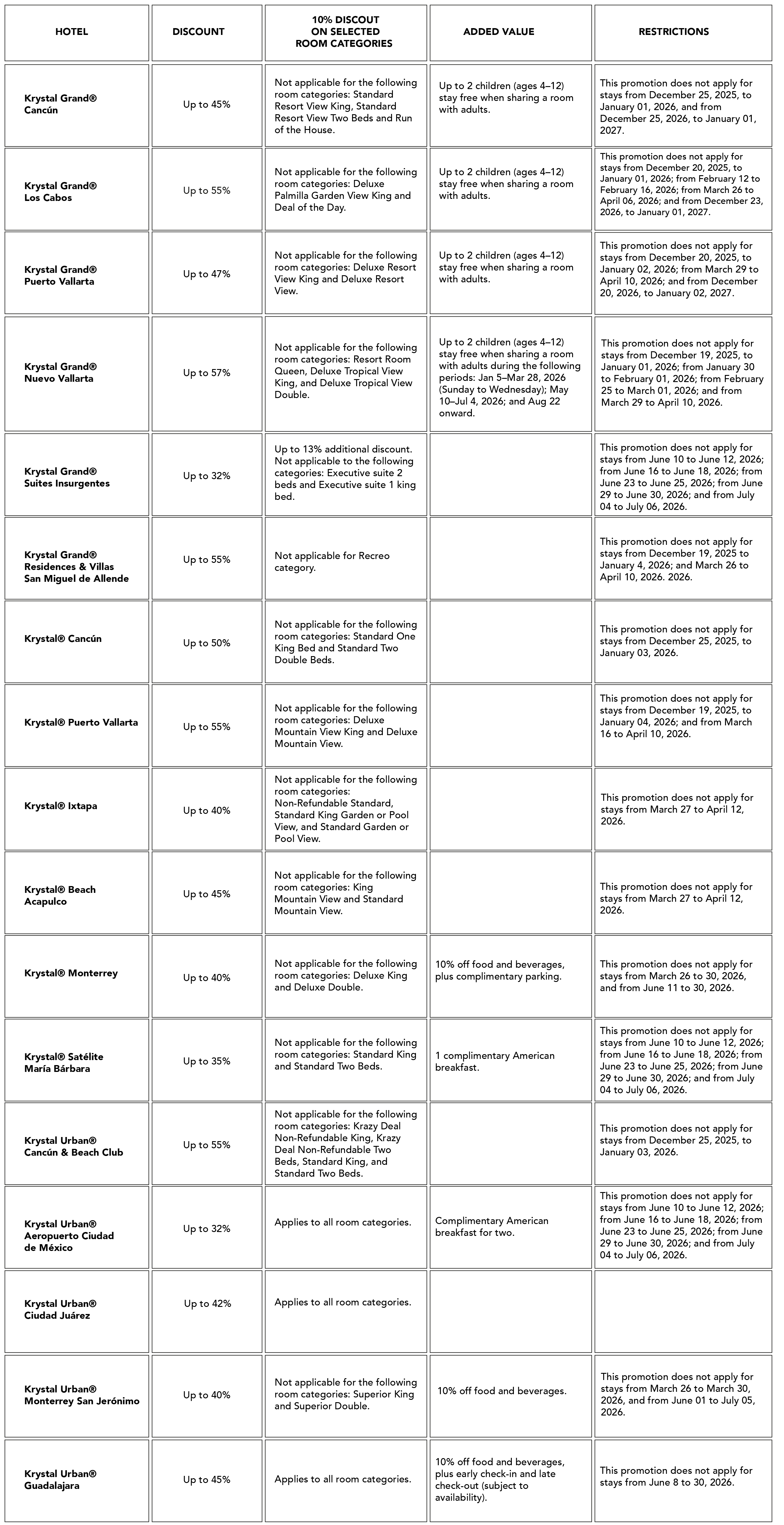 This promotional offer applies exclusively to our official website, krystal-hotels.com, and to the official websites of Krystal Hotels & Resorts® properties, as specified in the “Our Destinations” section.