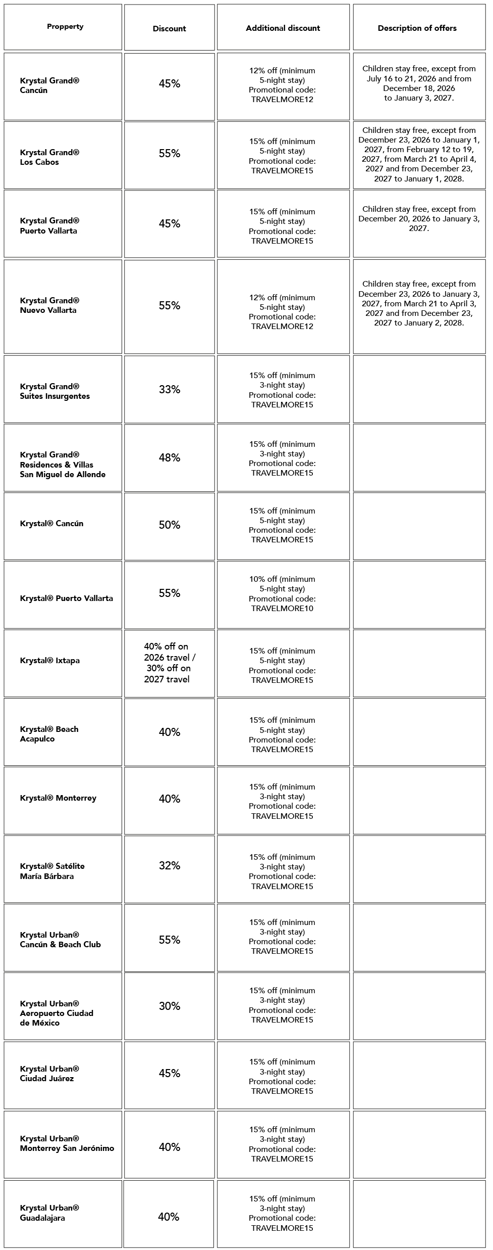 This promotional offer is for current and new Krystal® Hotels & Resorts guests who can receive up to 55% off at our hotels and up to an additional 15% off by booking a minimum of 5 nights at beach hotels and 3 nights at city hotels, using the promotional code corresponding to each hotel (see commercial offer for property section). All the above applies to the rates published on our official website https://www.krystal-hotels.com and on the official websites of each of our properties. Please note that this promotional offer must be paid for with applicable taxes, including VAT and ISH (lodging tax).